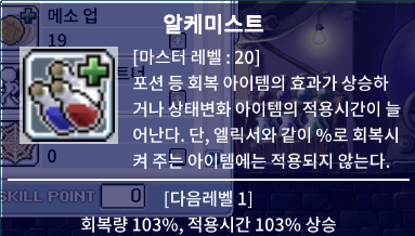 86부터는 요걸 찍으면서 마스터하고 93때는 이거랑 쌀소업을 마스터함 요놈도 쌀벌이(?)에 아주 중요한수단 ->마스터시 공격력,명중률같은것을 제외한 도핑약의 효과가 1.5배, 지속시간 5분짜리 물약이 7분30초. 30분짜리 지속약은 45분