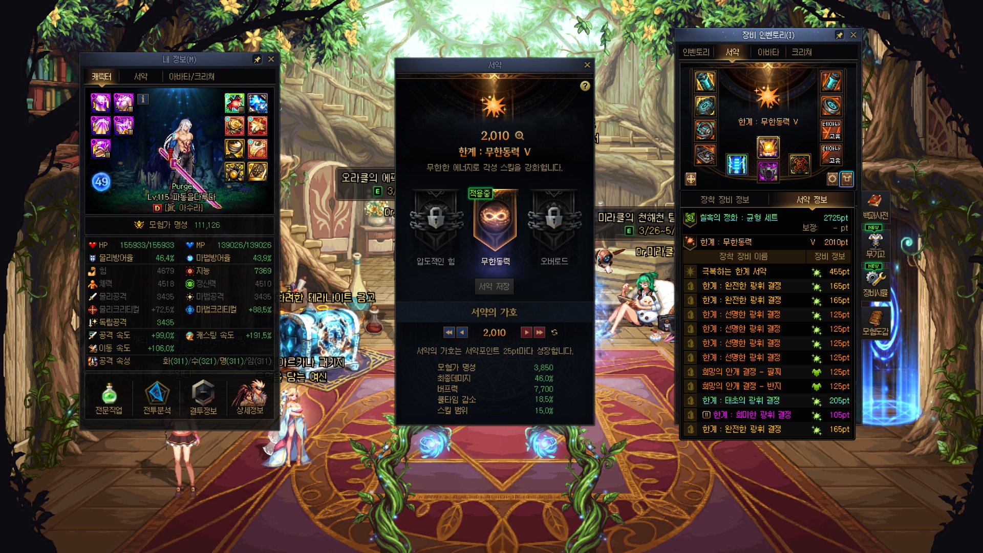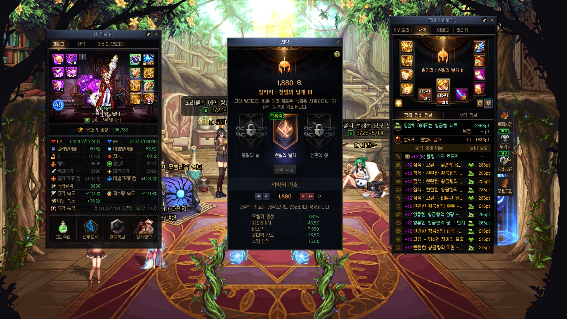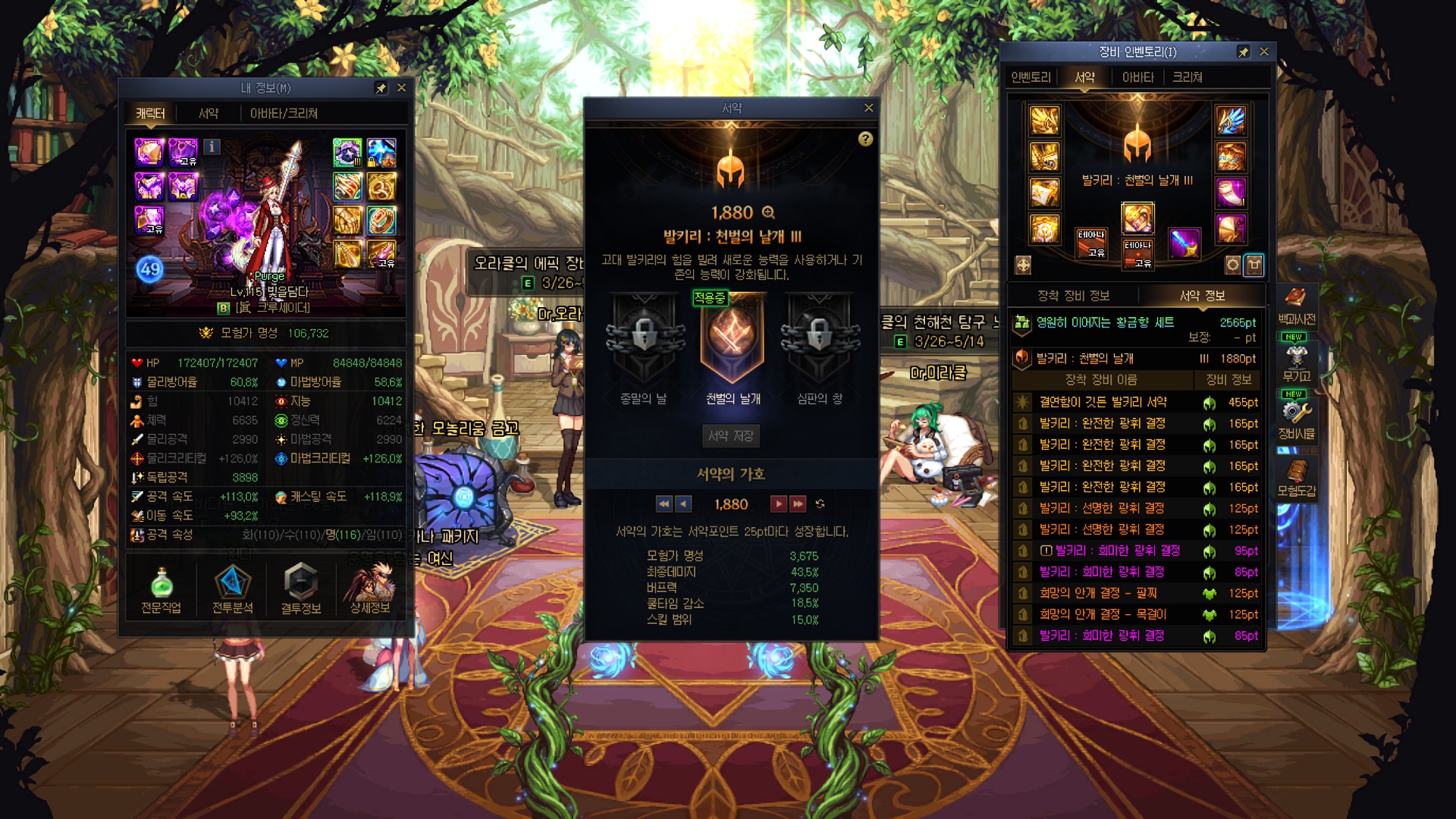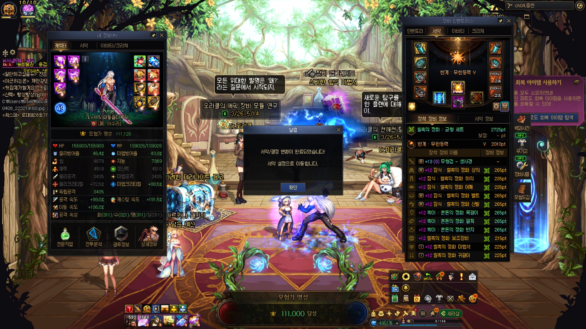 수라가 오늘 스펙업 미친듯이 잘 돼버렸네요....; 레전->에픽서약, 유닉->에픽결정 그냥 미친 스펙펌핑 ㅋㅋㅋㅋㅋㅋㅋㅋㅋㅋㅋㅋㅋㅋㅋㅋ 유닉 저울에서 유효타가 크게 터져줄 줄이야... 근데 그 이후에 깐 에픽저울 3개가 조져진건 좀 많이 유감스러운 부분 4번째로 명성 11만 돌파했네요 11만을 넘어 11.1만까지 돌파했다만